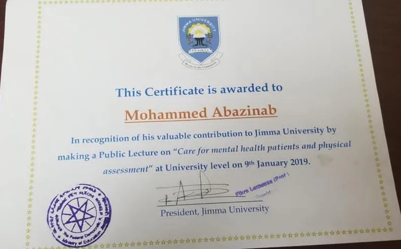 A public lecture was conducted on “Care for Mental Health Patient” on January 9, 2019, by President Mohammed Abazinab at Jimma University, Ethiopia. Mr. Mohamed is a renowned clinical educator from Calgary, Canada.